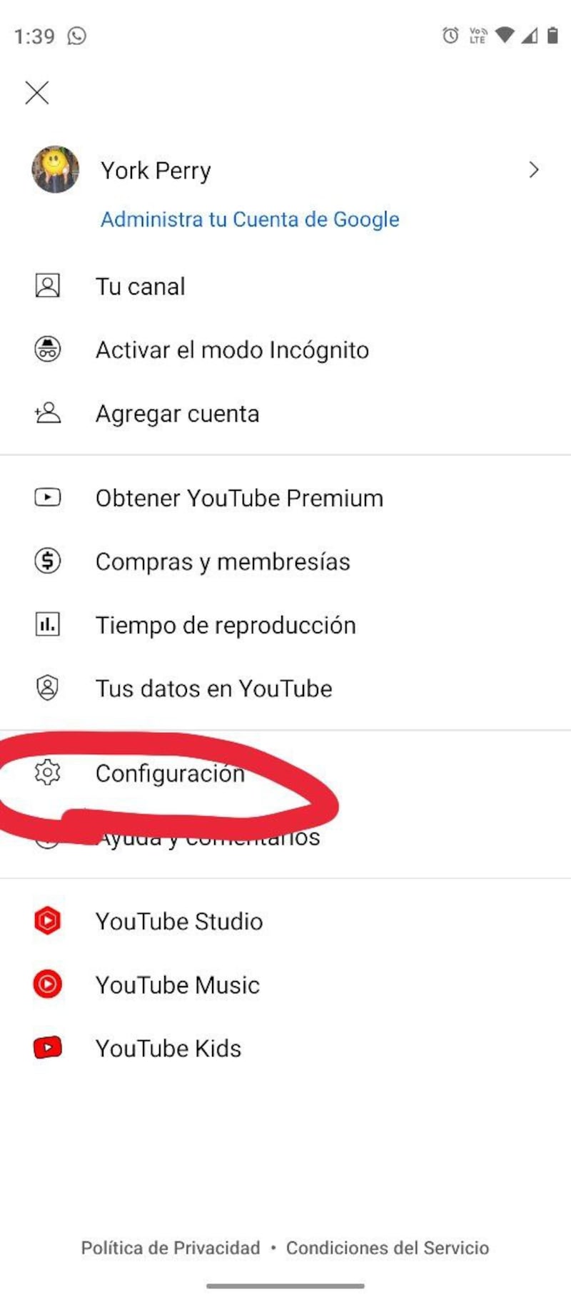 Lo primero que debemos hacer es abrir la aplicación de YouTube, dar tap en la esquina superior derecha donde está nuestra foto de perfil y luego ingresar a la opción de “Configuración”.