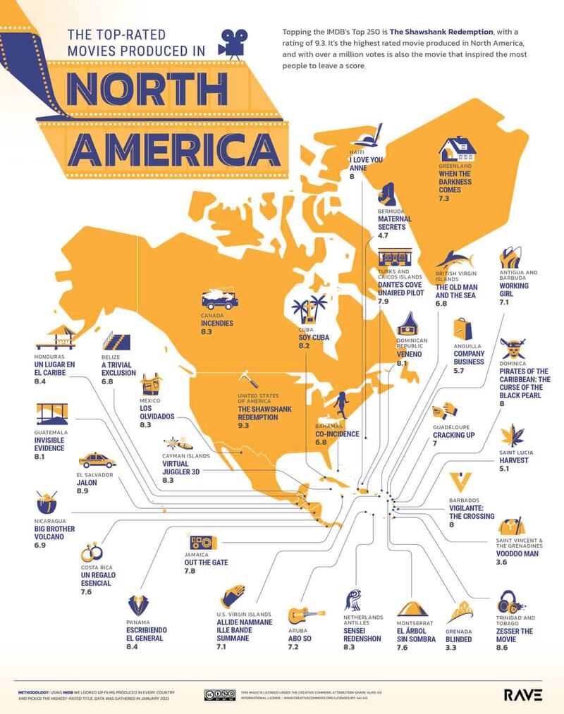 “Identificamos películas producidas en todos los países utilizando códigos de país IMDb y luego seleccionamos el título mejor calificado de las 50 mejores películas calificadas por el mayor número de usuarios. Solo se incluyeron largometrajes. Para los países donde no se produjeron títulos clasificatorios en ese país, se eligió una película ambientada en ese país utilizando los mismos criterios: largometraje mejor calificado entre 50 con la mayor cantidad de calificaciones dadas”, señala el sitio web sobre su metodología y fuente.