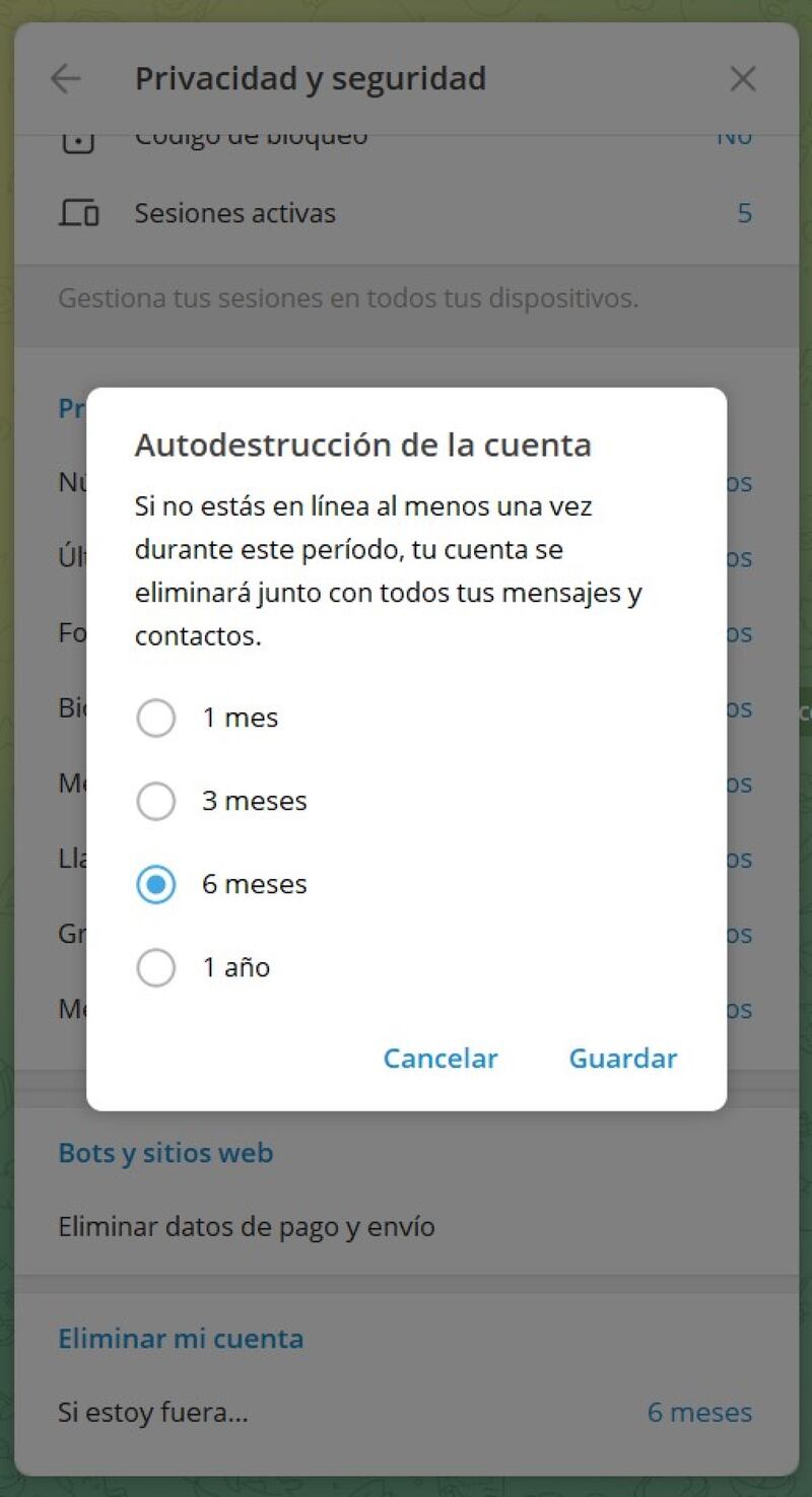 Telegram ofrece a sus usuarios la posibilidad de eliminar su cuenta si no ha sido utilizada en una determinada cantidad de tiempo. Esto permite a la persona proteger su privacidad.