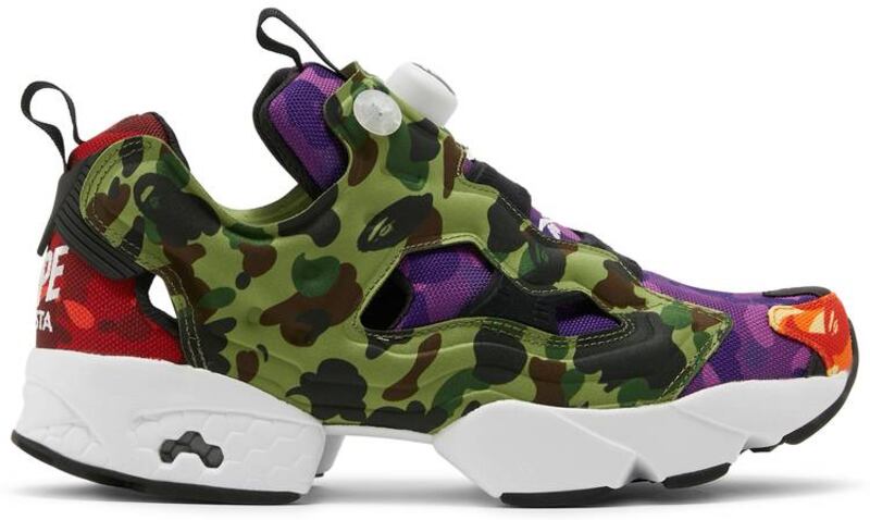 Diseñado en colaboración con BAPE, juega con el estampado de camuflaje de la marca japonesa de streetwear, manteniendo la tecnología Reebok Pump en lugar de los cordones comunes. Su mediasuela desacomplada es blanca, con amortiguación Hexalite en el talón. Costo: 180 dólares.