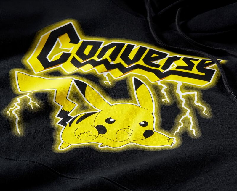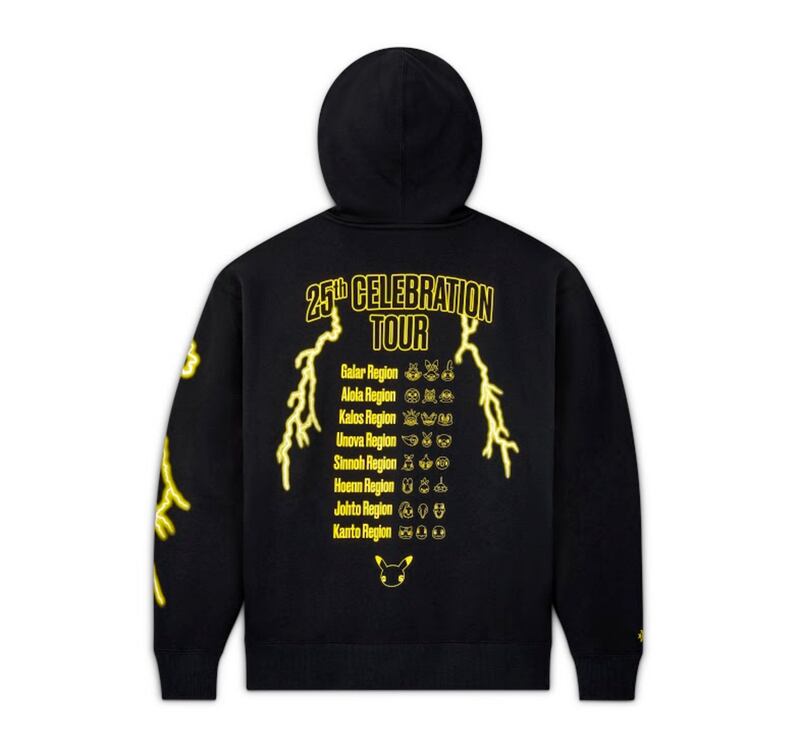 Polerón con gorro Pokémon 25th Celebration: inspirada en productos de la gira de rock, la polera con gorro, está diseñada con gráficos de Converse y Pokémon “electrificados”, inspirándose tanto en los poderes eléctricos de Pikachu como en los diseños de bandas de metal.