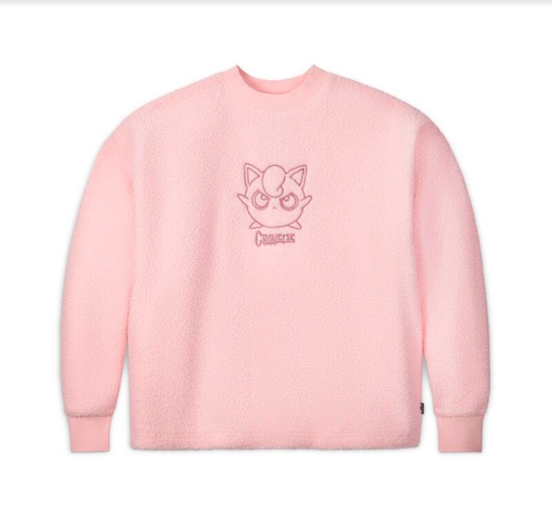 Suéter de cuello redondo de sherpa Jigglypuff: Este suéter está bordado con un gráfico vanguardista de Jigglypuff, que acentúa aún más la dualidad de la personalidad linda pero atrevida del Pokémon.