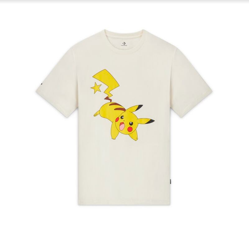Polera equipo Pokémon y Pikachu: Las camisetas de manga corta resaltan los favoritos de Pokémon a través de estampados gráficos. La polera de manga tiene un Pikáchu centrado, incorporando su cola como parte del logo de estrella de Converse. Esta prenda llega a $24.990 pesos chilenos, valor preferencial.