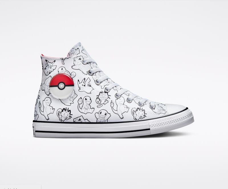 Poké Ball Chuck Taylor All Star: La zapatilla de baloncesto original se reinventa con un elenco completo de personalidades Pokémon. Este diseño presenta un patrón completo de Pokémon impreso contra una parte superior de lona blanca, en el lateral de la silueta, una Pokebola abombada que se puede apretar.
