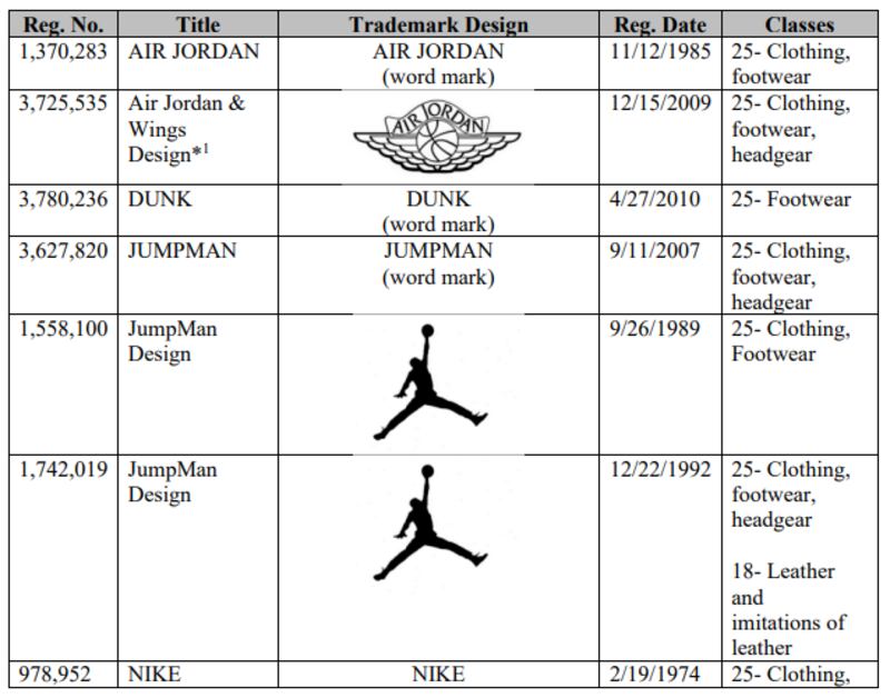 La marca Air Jordan, de las zapatillas creadas para el novato Michael Jordan, de los Chicago Bulls, se registró el 12 de noviembre de 1985. Mientras que el logo del JumpMan está protegido legalmente desde el 26 de septiembre de 1989.