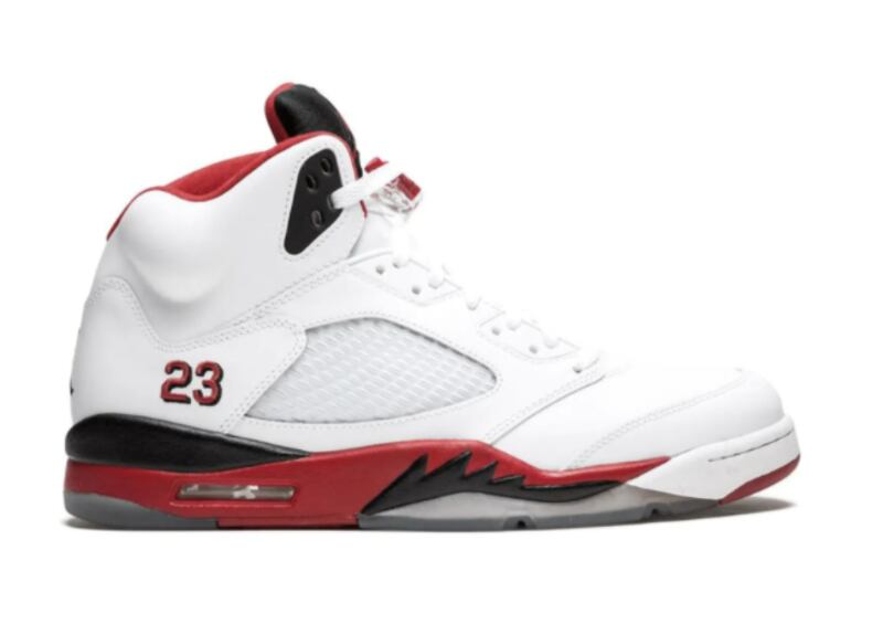 Para cerrar la lista, las Air Jordan 5 Retro, que se le suma el 23 de Su Majestad, Michael Jordan, en los laterales. Las zapatillas son blancas con suelas rojas, negras y grises.