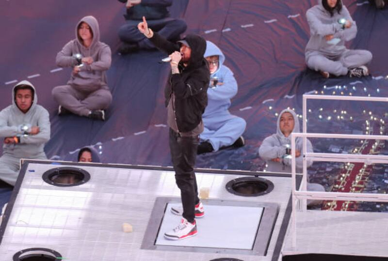 Marshall Mathers III, el legendario rapero conocido como Eminem, lució en el espectáculo del entretiempo del Super Bowl LVI este modelo hecho por la Jordan Brand especialmente para él.