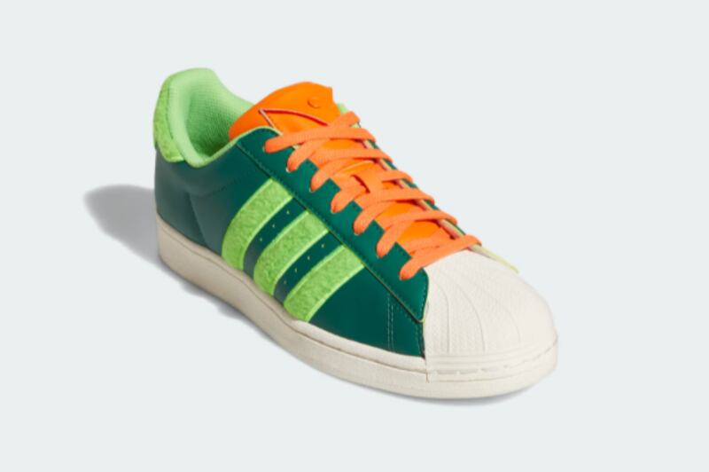 Las ochentosas zapatillas basqueteras utilizan los elementos de Kyle, con colores verdes oscuros y claros (como en el tobillo y en las bandas tradicionales de Adidas), además de una lengüeta naranja. La puntera y las suelas de la Superstar son blancas. Precio: 100 dólares.