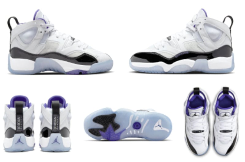 La combinación de colores con microfibras blancas y cuero genuino negro intenso constituyen un homenaje a las Air Jordan 11 Concord: de allí su nombre. También posee detalles morados en las plantillas y la suela exterior.