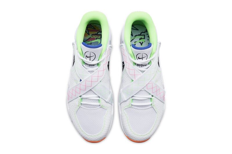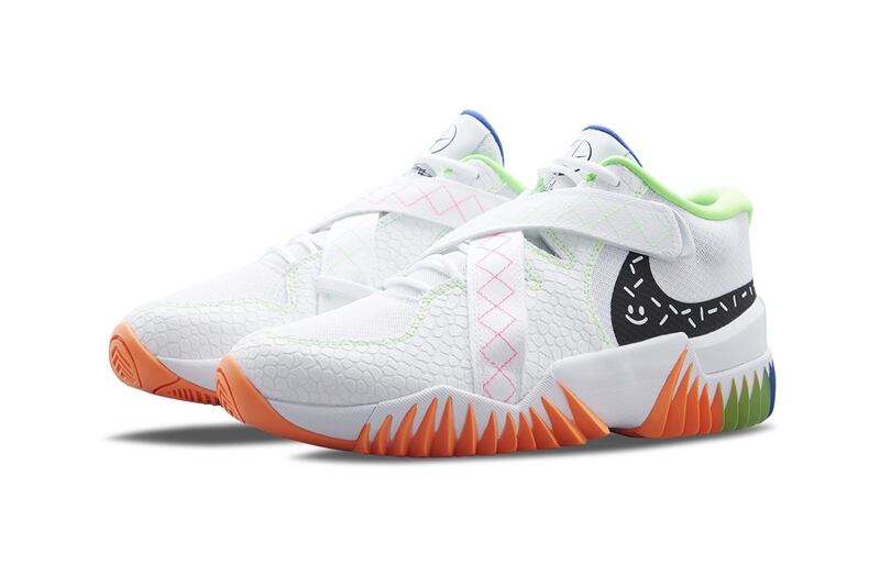 La presentación blanca cuenta con elementos similares: texturas escamosas, correas cruzadas y puntas dentadas de la suela.