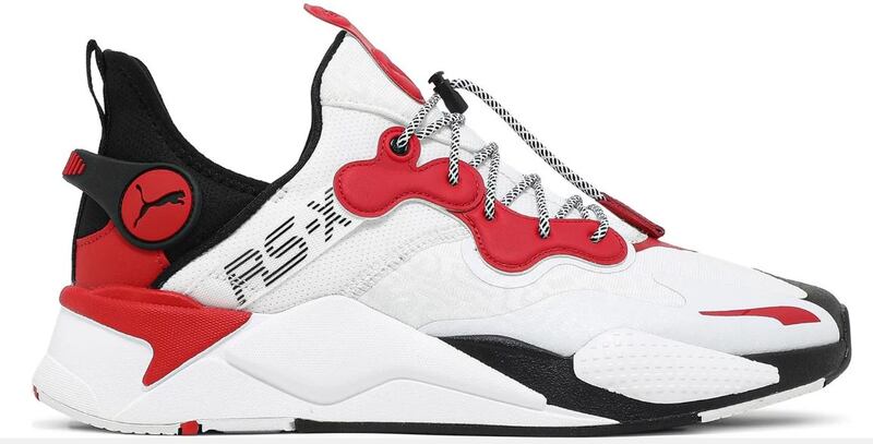 Su parte superior es de tela blanca con un sistema de cordones, superposiciones tonales sin costuras y detalles contrastantes en rojo y negro. La amortiguación utiliza una entresuela de poliuretano, con núcleo de espuma RS suave y paredes laterales con piezas geométricas de TPU.