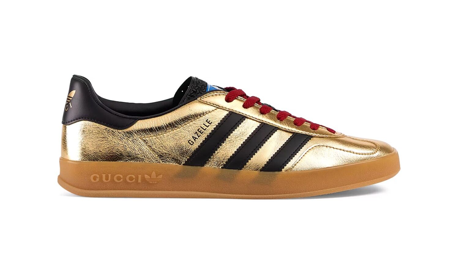 El tono dorado similar a la lámina cubre toda la parte superior de la zapatilla, mientras que los toques de rojo y azul se ubican en la lengüeta negra. La unidad de suela de goma de la Gazelle se completa con la marca Gucci en el cuarto lateral trasero.