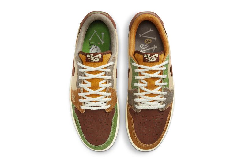 La parte superior de las Zion Williamson x Air Jordan 1 Low OG Voodoo está hecha de retazos, mezclando cáñamo, lienzo y panel de gamuza.