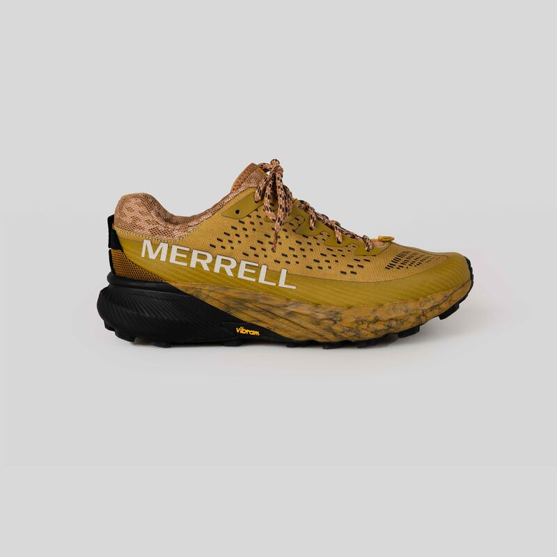 La colección House of the Dragon x Merrell ofrece un trío de estilos, comenzando con Agility Peak 5 representando la Casa Targaryen. Este modelo combina colores amarillos que recuerdan al escudo de Targaryen, con detalles en negro en partes de la suela. Se encuentran más detalles en la lengüeta, el conjunto de encaje, el cuello y la plantilla, cada uno con un tono tostado. La parte superior cuenta con una construcción de malla transpirable. Un soporte de encaje personalizado con forma de trío de dragones y el escudo de la familia Targaryen en la plantilla realzan aún más el tema.