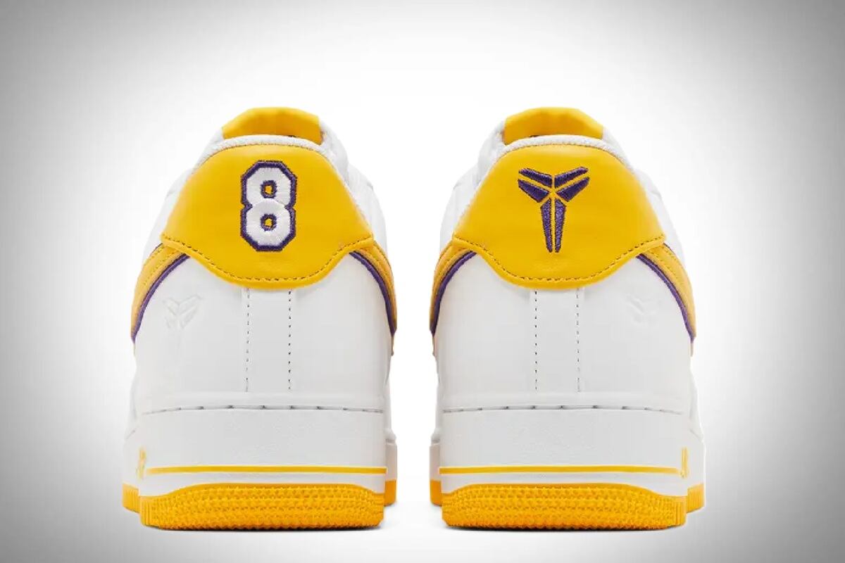 Nike y Jordan Brand se unen para rediseñar uno de sus íconos mundiales, para añadirle un sentido homenaje a Kobe Bryant. Las Air Force 1 cambian sus colores para estas zapatillas y llevan el número 8 y los colores de Los Ángeles Lakers, franquicia donde supo brillar el basquetbolista.