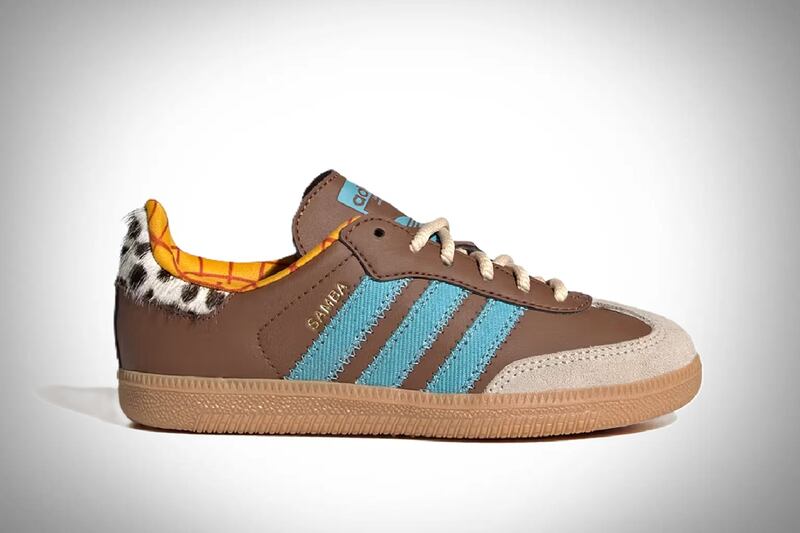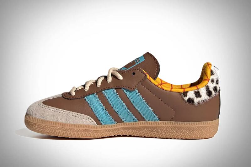 Sin darle muchas vueltas, el diseño de las sneakers refleja la esencia más básica de Woody como personaje. Combina los materiales y colores fieles al atuendo del vaquero. La parte superior está confeccionada en cuero marrón, mientras que las clásicas tres franjas de adidas aparecen en azul denim, evocando sus jeans.
