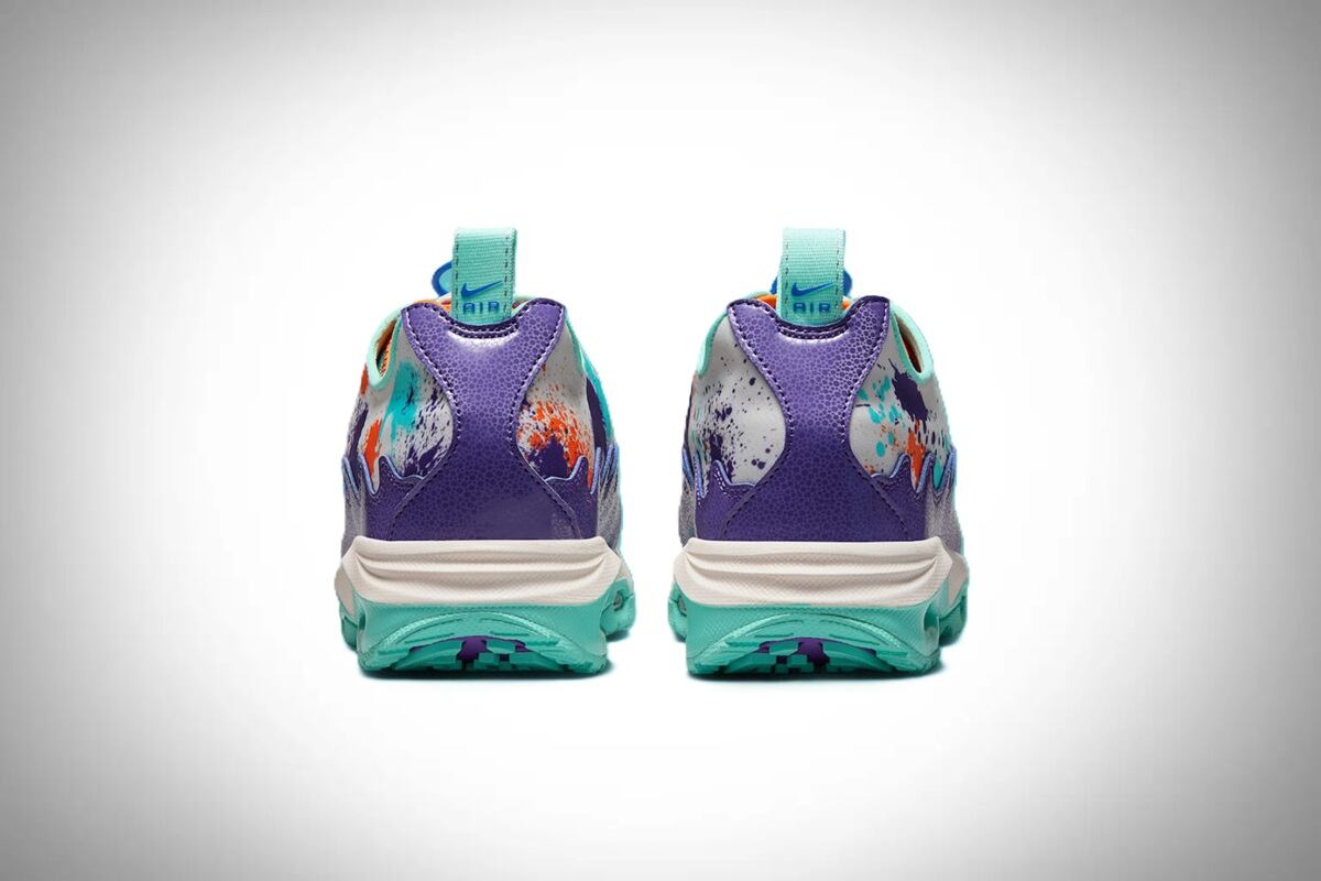 Las zapatillas presentan una base de malla blanca con un vibrante estampado de salpicaduras multicolores que aporta dinamismo y energía. En el lateral, un guardabarros de cuero morado modificado introduce un diseño escamoso tonal que evoca la columna vertebral puntiaguda de un dragón, simbolizando fortaleza y resistencia.
