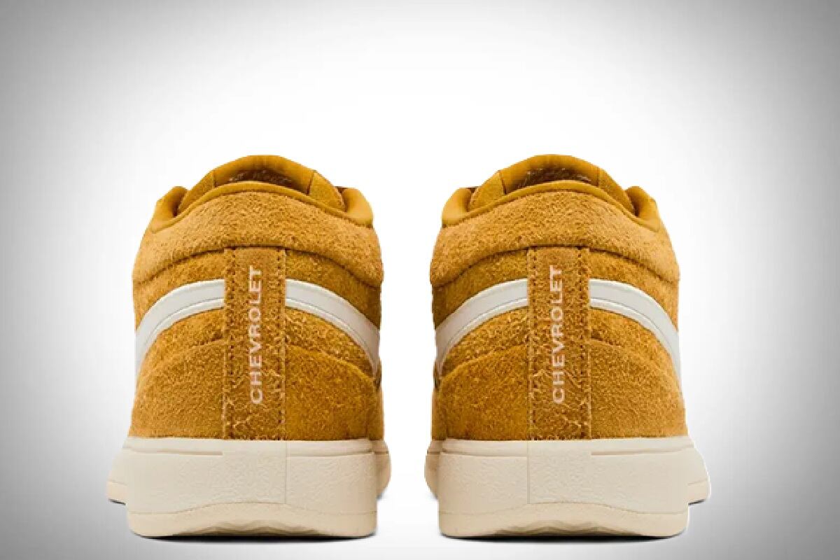 Su influencia se deja ver desde el primer vistazo. Según reseña Goat, la parte superior está cubierta por un ante peludo en tono amarillo dorado que remite a los acabados retro de los muscle cars setenteros. El Swoosh de cuero color vela, bordado con sutileza, suma elegancia sin restar fuerza.