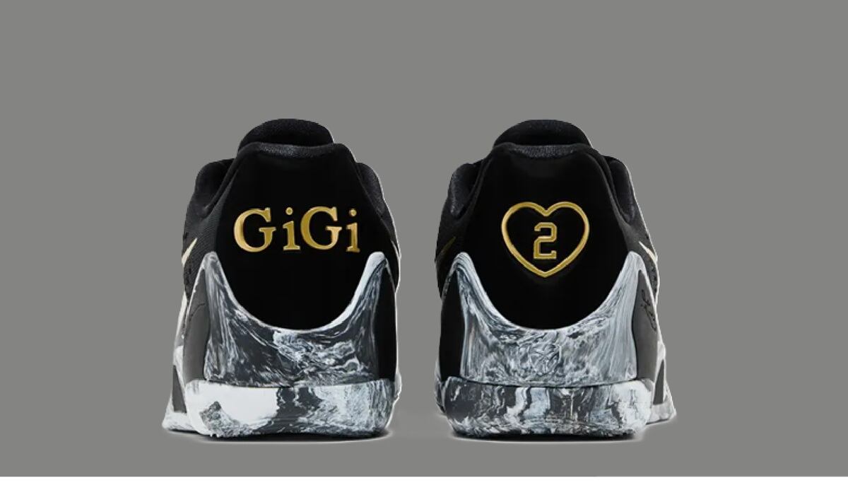 A primera vista, destaca su parte superior de malla de ingeniería, que presenta una transición visual sutil pero poderosa: una gradación de gris a negro que evoca tanto elegancia como profundidad. El gancho dorado metálico, junto con los detalles en oro en el talón, donde se puede leer “Gigi”, y el escudo de Kobe en la lengüeta, aportan un toque solemne y conmemorativo sin dejar de ser refinado.