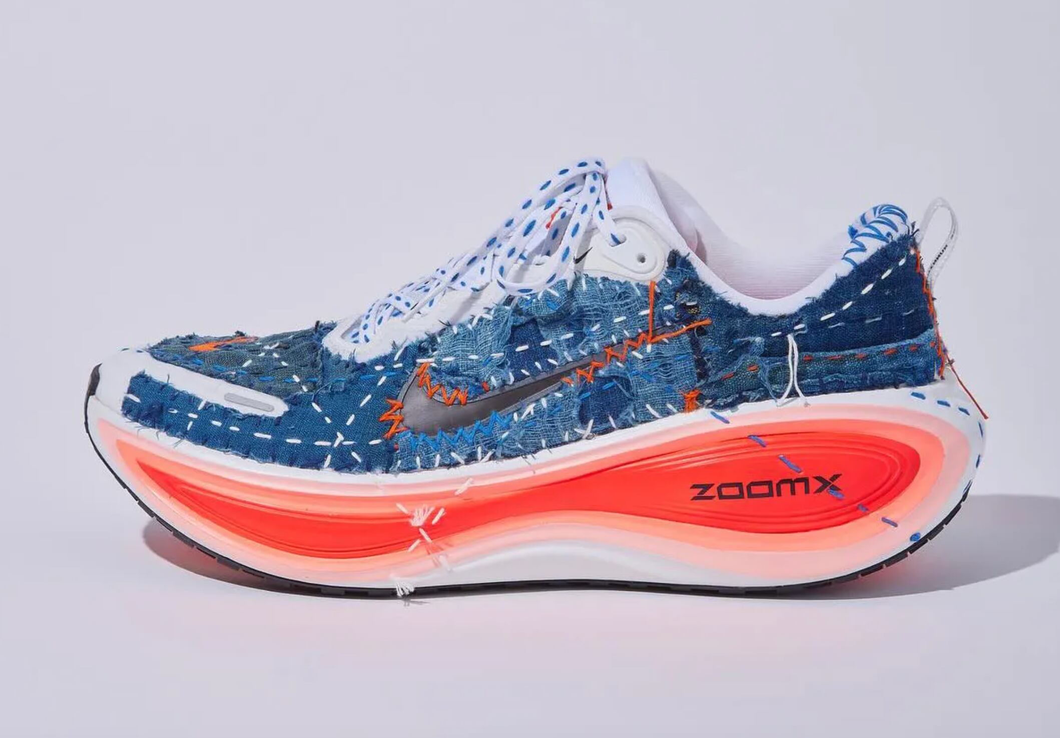 El diseño transforma una combinación de colores existente del modelo Vomero Plus. La parte superior de la zapatilla presenta un intrincado patchwork de tonos azules, complementado con el característico bordado blanco de la técnica Sashiko y sutiles toques de rojo para armonizar con la amortiguación ZoomX de la suela.
