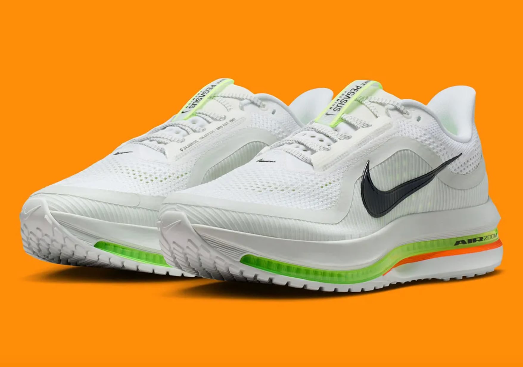 - Acentos Volt y Naranja: El icónico verde neón de Nike y el naranja vibrante se sitúan en los puntos de mayor tensión visual, como el logo y la zona de la amortiguación, otorgando un look futurista.