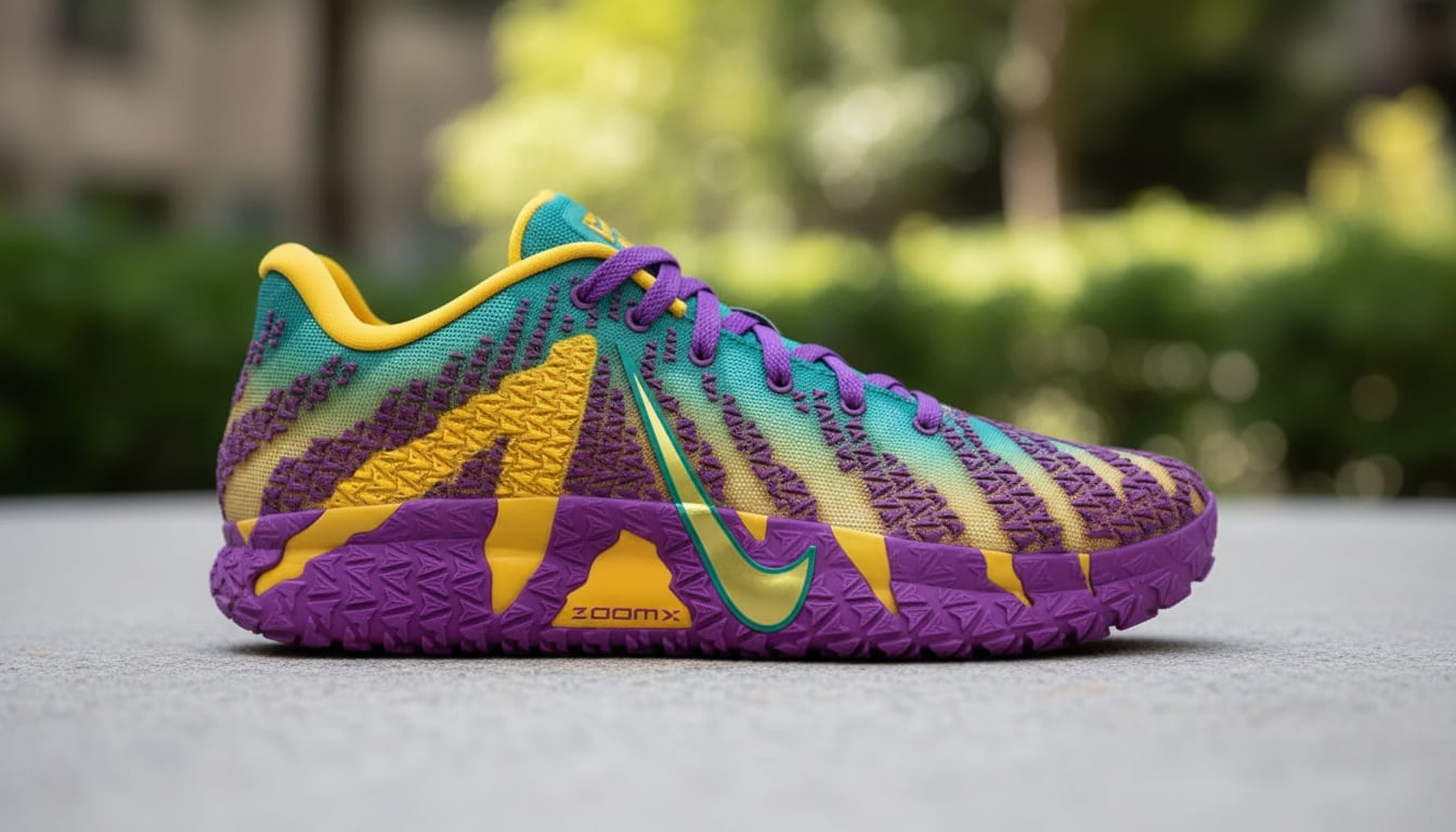 El Nike Ja 3 “Mardi Gras” utiliza una base de color púrpura profundo sobre la cual resaltan acentos en verde esmeralda y detalles en amarillo oro, simbolizando la justicia, la fe y el poder.